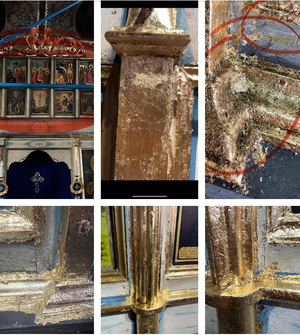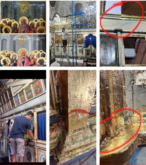 Паралелно с изнасянето на икони, от август месец отец Виктор започна с лични помощници, всички без никакъв професионален опит в реставрирането да лепят шлагметални златни листчета позлата по дървената част на иконостаса, който материал .видимо радикално го променя. Бързо се окислява, а църквата е вкопана, пълна с влага- всичко това скоро ще мухляса, както е мухлясала облепената със “злато” колона на Св. Георги в църквата “Св. вмчк Георги Победоносец “, позлатена от отеца преди около година и половина. Материалът, който се поставя, е неподходящ за облика на двувековна църква.