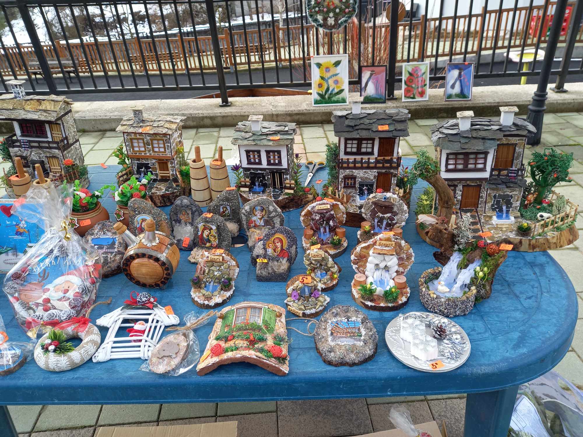 В селцето с размери 1.40 на 0.70 метра има кладенец, водопад с поток, мост, чешмички, пещ, крава с купа сено, птички, алеи с дървесен мъх за трева. На два от дворовете е поставила маси със столове, фруктиери с плодове, елхички.