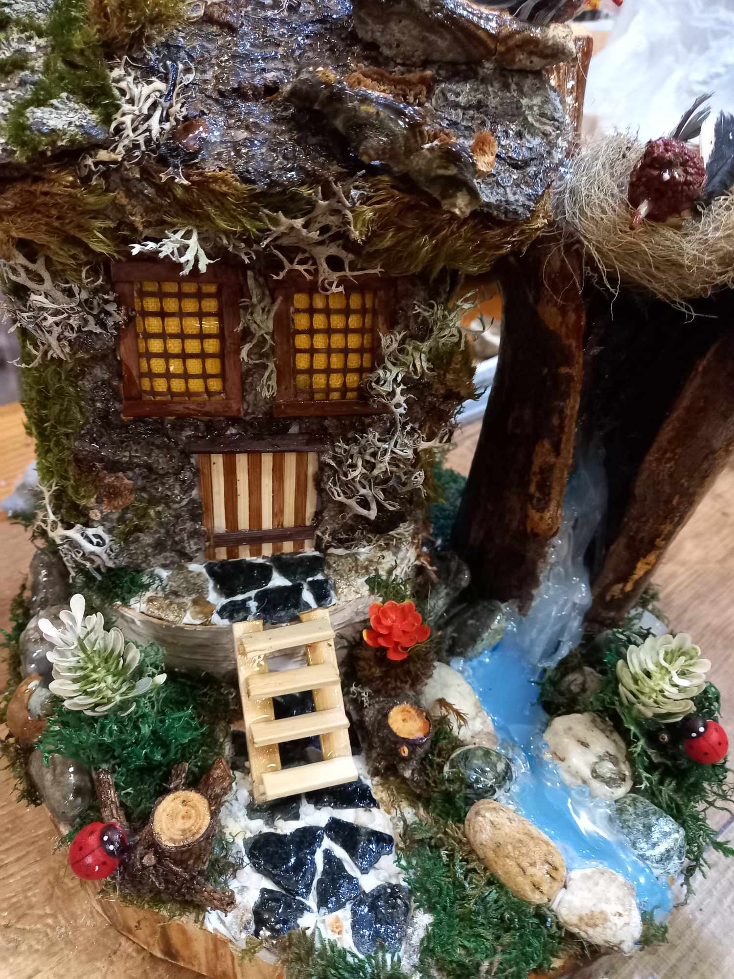 Споделя, че водопадите са много трудни. Прави ги от топъл силикон и отнемат много време, за да ги уподоби на истинските.