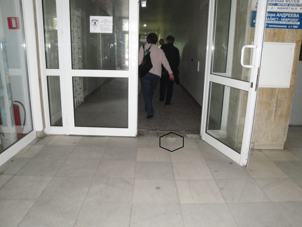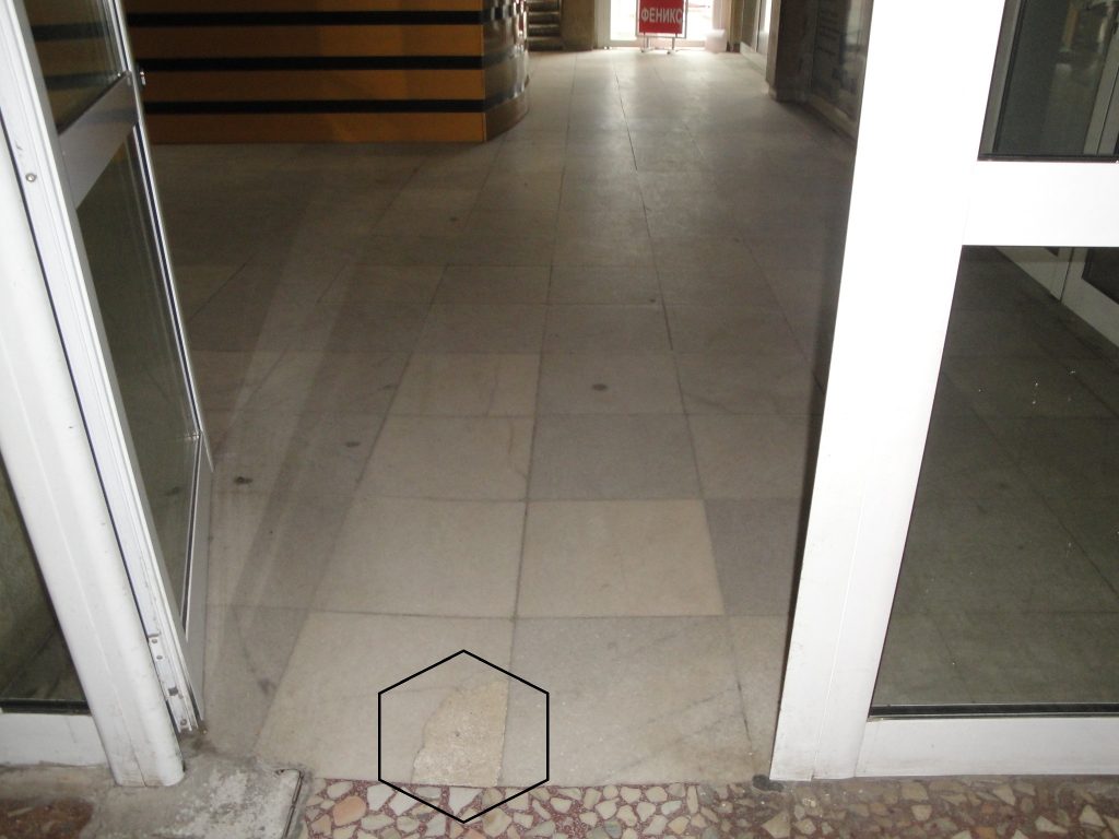 Причината – счупената мраморна плочка точно пред алуминиевата врата на фоайето не е в имот на МБАЛ – Смолян. Нейната собственост започва 5 сантиметра по-напред – където е настилката от венецианска мозайка.