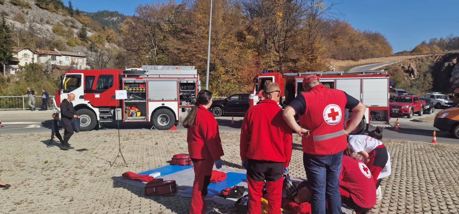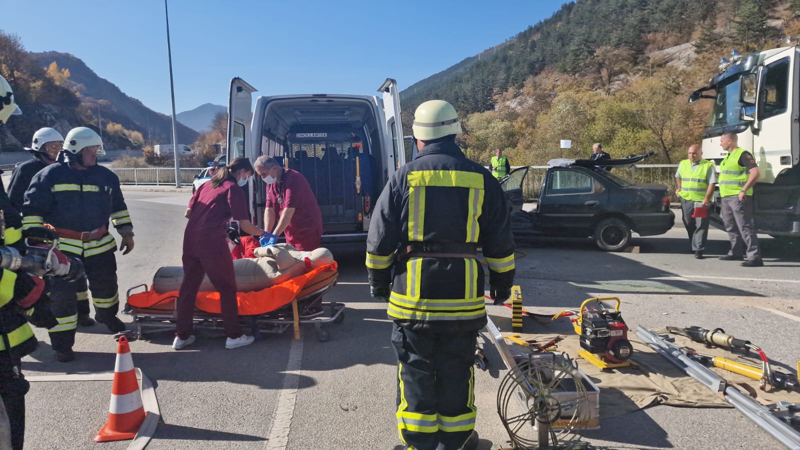 Готовността им за реакция бе тествана чрез проиграване на ситуация на възникнало пътнотранспортно произшествие на кръстовище в участък „ГПК – новата отсечка“, след тунела в кв. Устово посока гр. Смолян.