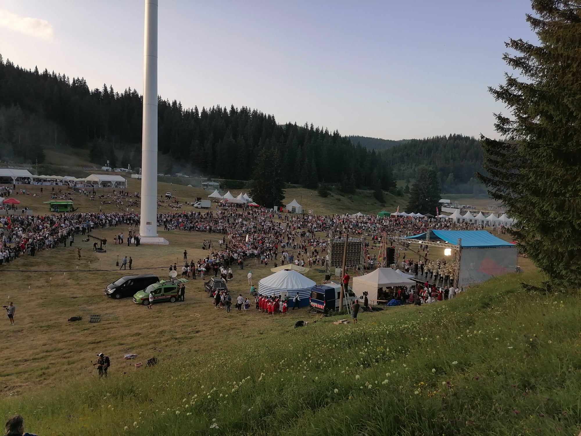 Националният трибагреник беше донесен до 111-метровия пилон под звуците на каба гайди от доброволци във фолклорни носии. Преди това на сцената се изявиха фолклорни състави, рецитирани бяха патриотични стихове от български класици.
